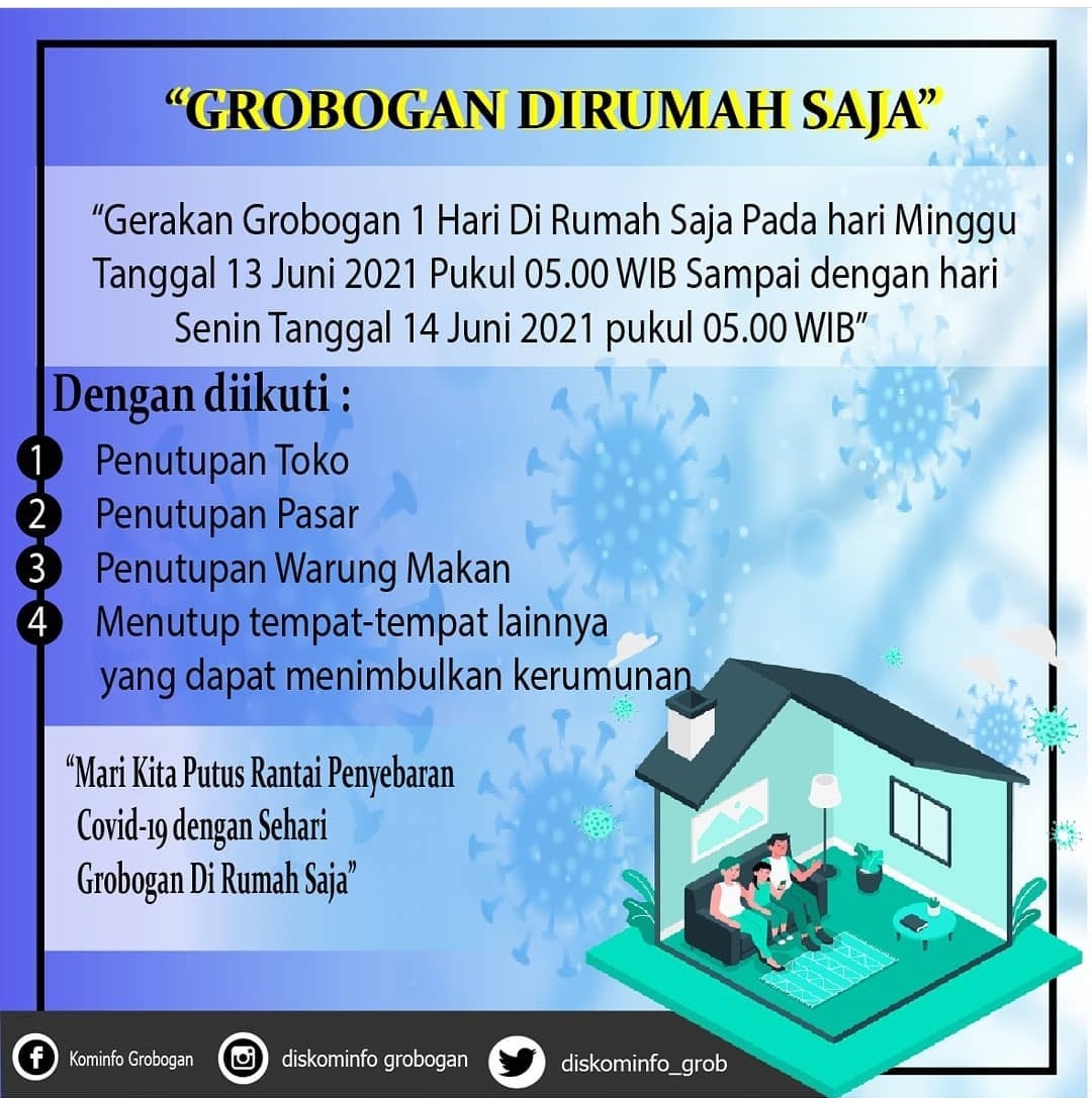 Dalam surat tersebut dijelaskan bahwa Gerakan Grobogan 1 Hari di Rumah Saja dimulai hari Minggu tanggal 13 Juni 2021 Pukul 05.00 WIB sampai dengan Hari Senin tanggal 14 Juni 2021 Pukul 05.00 WIB. Gerakan tersebut dilaksanakan dengan ketentuan sebagai berikut :