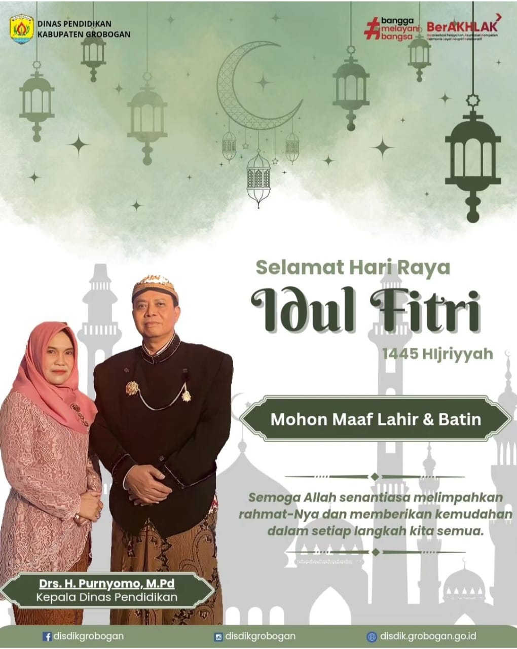 Keluarga Besar Dinas Pendidikan Kabupaten Grobogan mengucapkan "SELAMAT IDUL FITRI 1 SYAWAL 1445 H" Mohon maaf lahir dan batin atas segala kekhilafan. Semoga Allah SWT senantiasa memberikan kesehatan, umur panjang, rizki berlimpah dan barokah serta lindunganNYA.