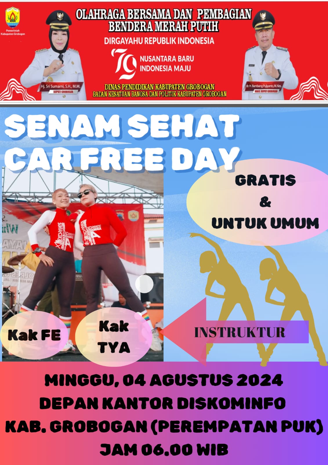 Mari datang dan ramaikan Senam Sehat pada Car Free Day, Minggu 4 Agustus 2024, titik lokasi depan Kantor Dinas Komunikasi dan Informatika Kabupaten Grobogan. Dalam acara tersebut akan dilaksanakan senam sehat bersama dan pembagian Bendera Merah Putih.