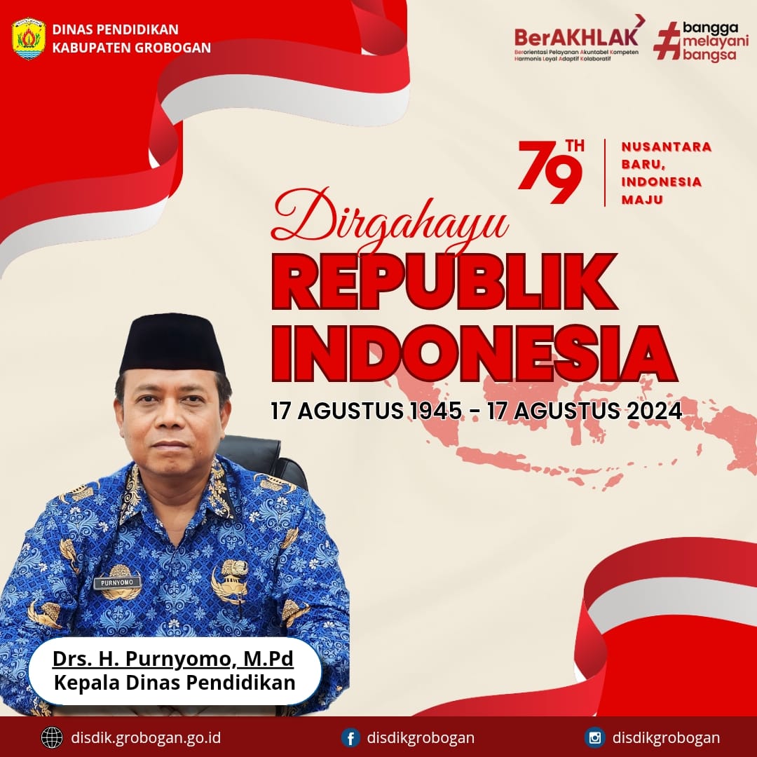 Upacara Peringatan Hari Ulang Tahun Kemerdekaan Ke 79 Republik Indonesia Tahun 2024, dilaksanakan hari Sabtu tanggal 17 Agustus 2024. Pelaksanaan Upacara berlangsung dengan tertib dan khitmad. Setelah mengikuti Upacara Pengibaran di Alun Alun Purwodadi secara daring, seluruh karyawan dan karyawati di Dinas Pendidikan Kabupaten mengikuti Upacara Detik Detik Proklamasi yang disiarkan langsung dari Ibu Kota Nusantara (IKN). Tak hanya itu, peringatan Hari Kemerdekaan RI kali ini dilaksanakan acara pemotongan tumpeng sebagai wujud syukur kepada Tuhan YME merayakan kemerdekaan.